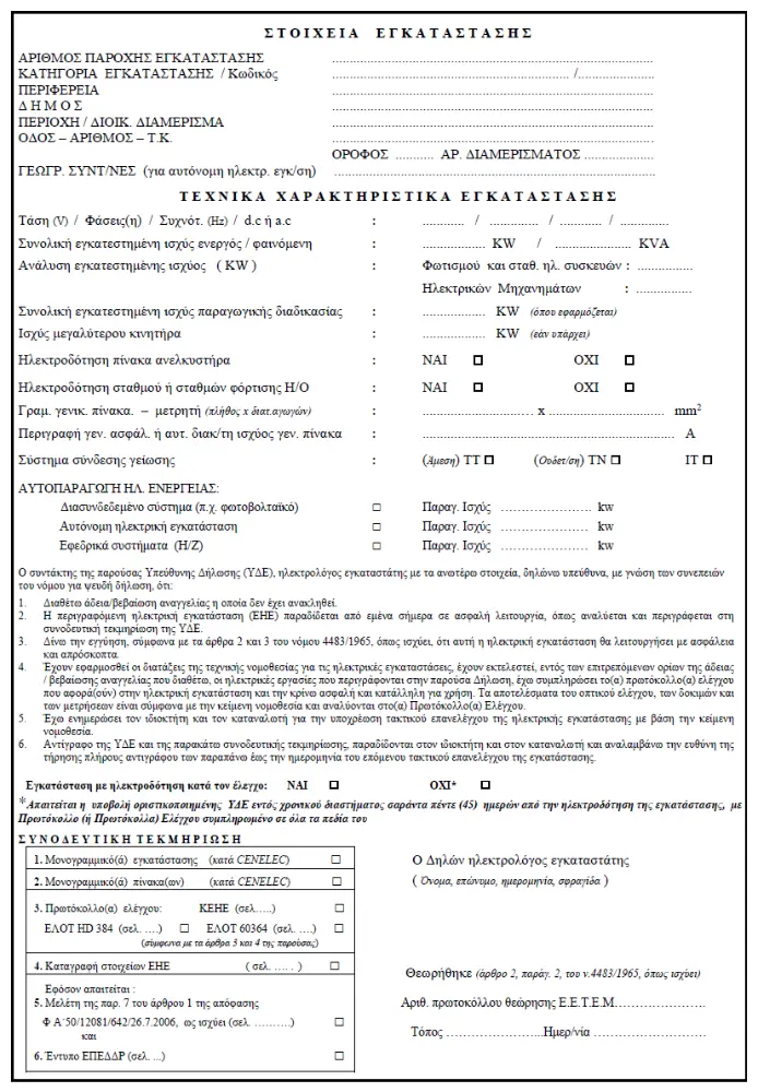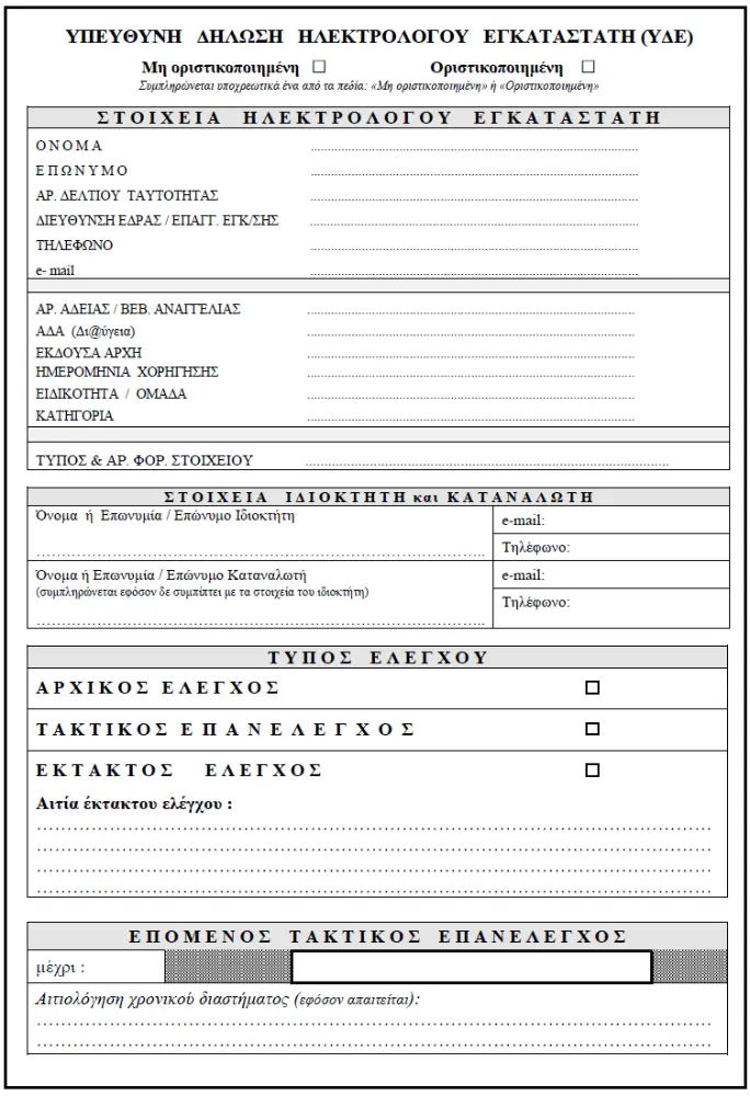 Υπεύθυνη Δήλωση Εγκαταστάτη Ηλεκτρολόγου (ΥΔΕ)