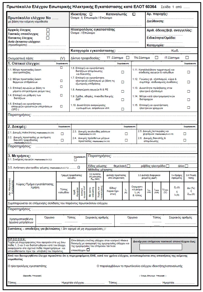 - Πρωτόκολλο Ελέγχου Ηλεκτρικής Εγκατάστασης κατά ΕΛΟΤ HD 384.
